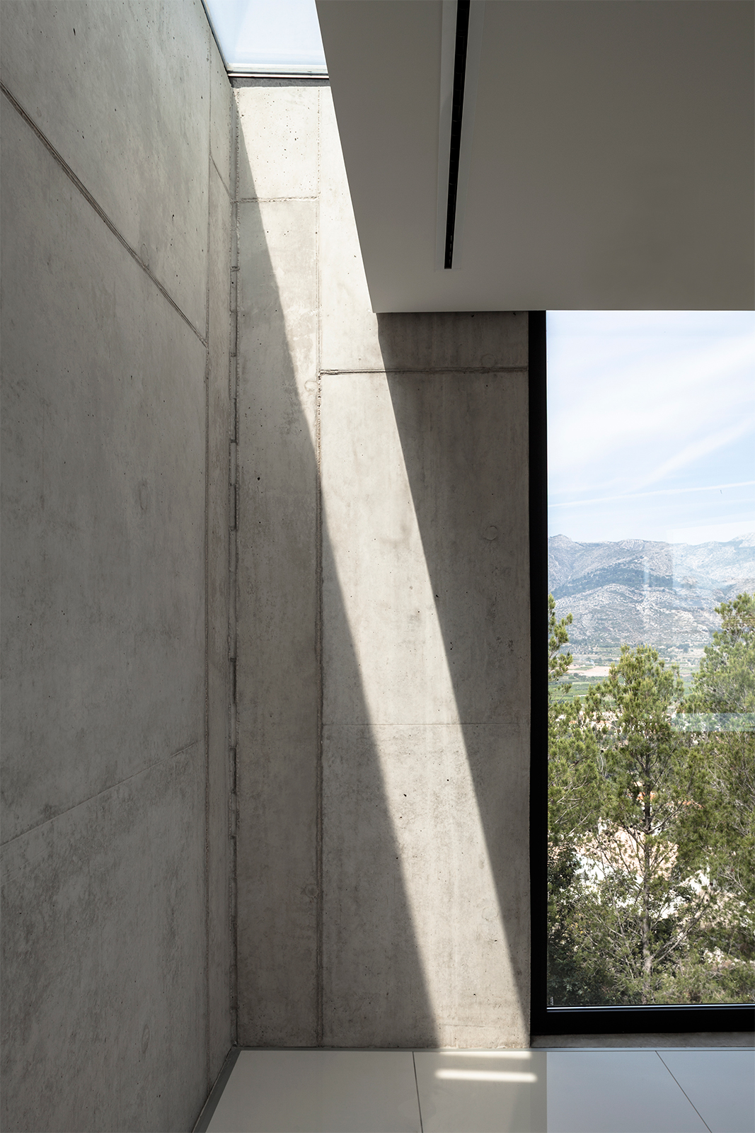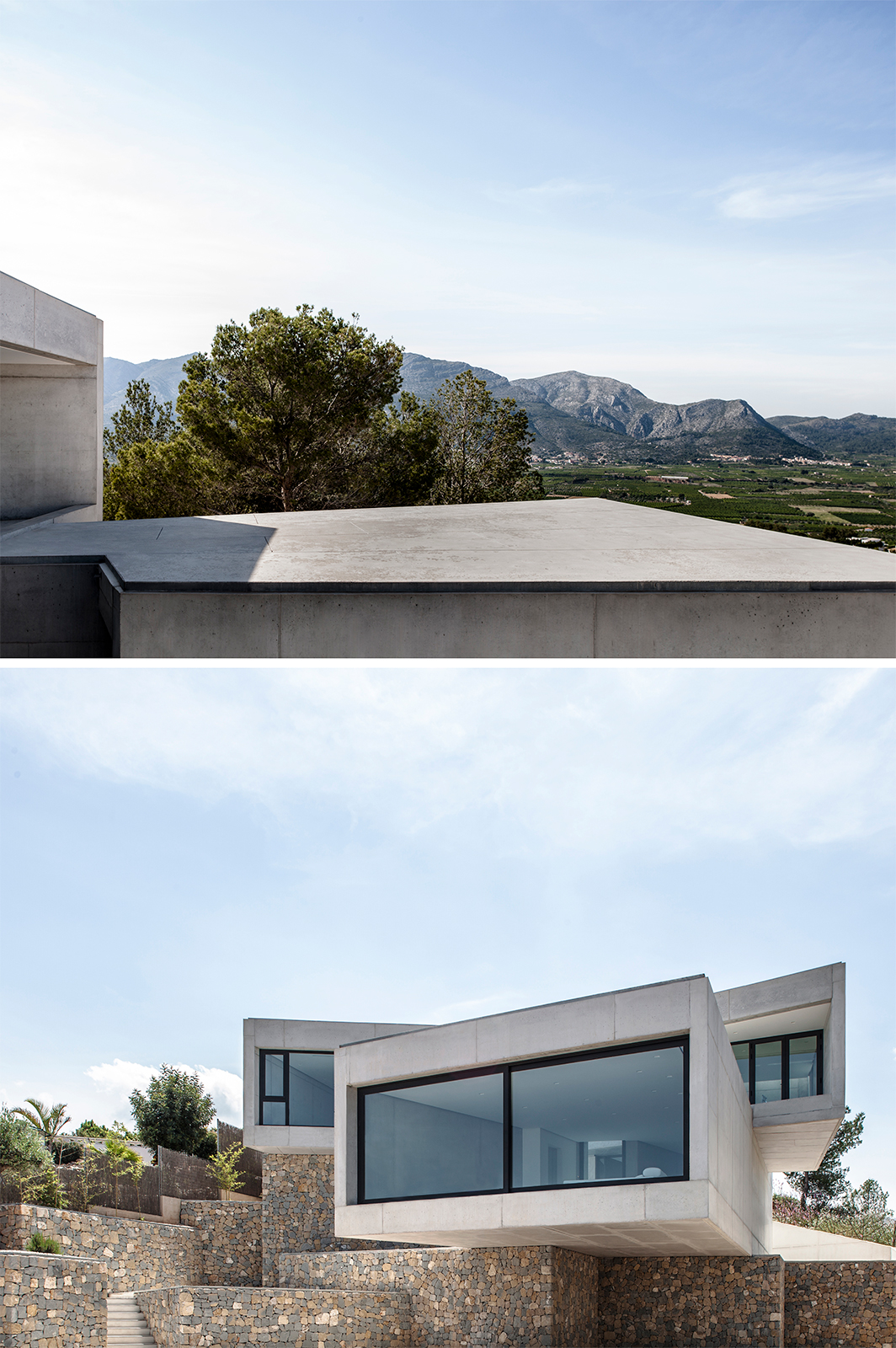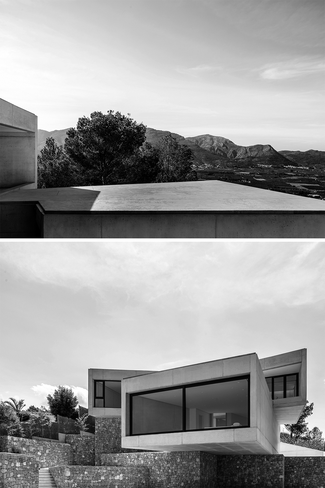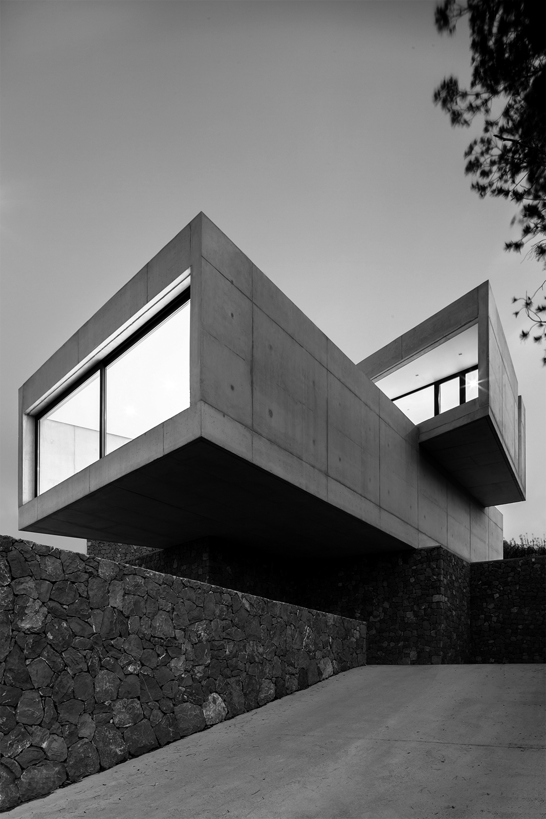On the ascending trail to the house, the pathways of the plot create an alignment of visuals, in which the volumes of the house, placed like two superposed parts are seen in their ultimate grandiosity. In this way, the Aspre House is structured over two levels, two boxes of reinforced concrete, of an expressive nature, orthogonally situated and supported by the same stonework walls which divide the garden. Each room, responding to the programme of uses, whilst also possessing clear relational intentions, is dedicated to a day and night use on the ground and first floors respectively. At the convergence of both prisms, the access is found, distorting itself slightly towards the interior of one of its larger sides in order to indicate the entry and preserve part of the existing vegetation. The hard concrete doubles up on itself so that the tree can grow, like flowers born of a rock, whilst also enabling the appearance of intermediary spaces such as galleries and terraces.