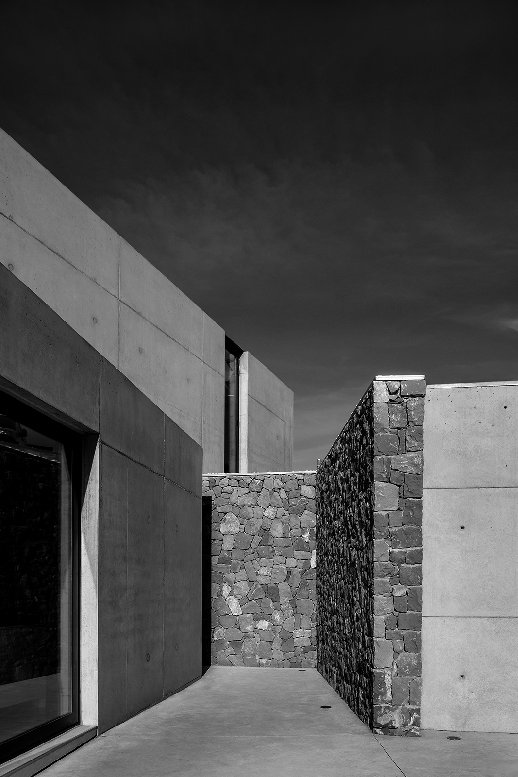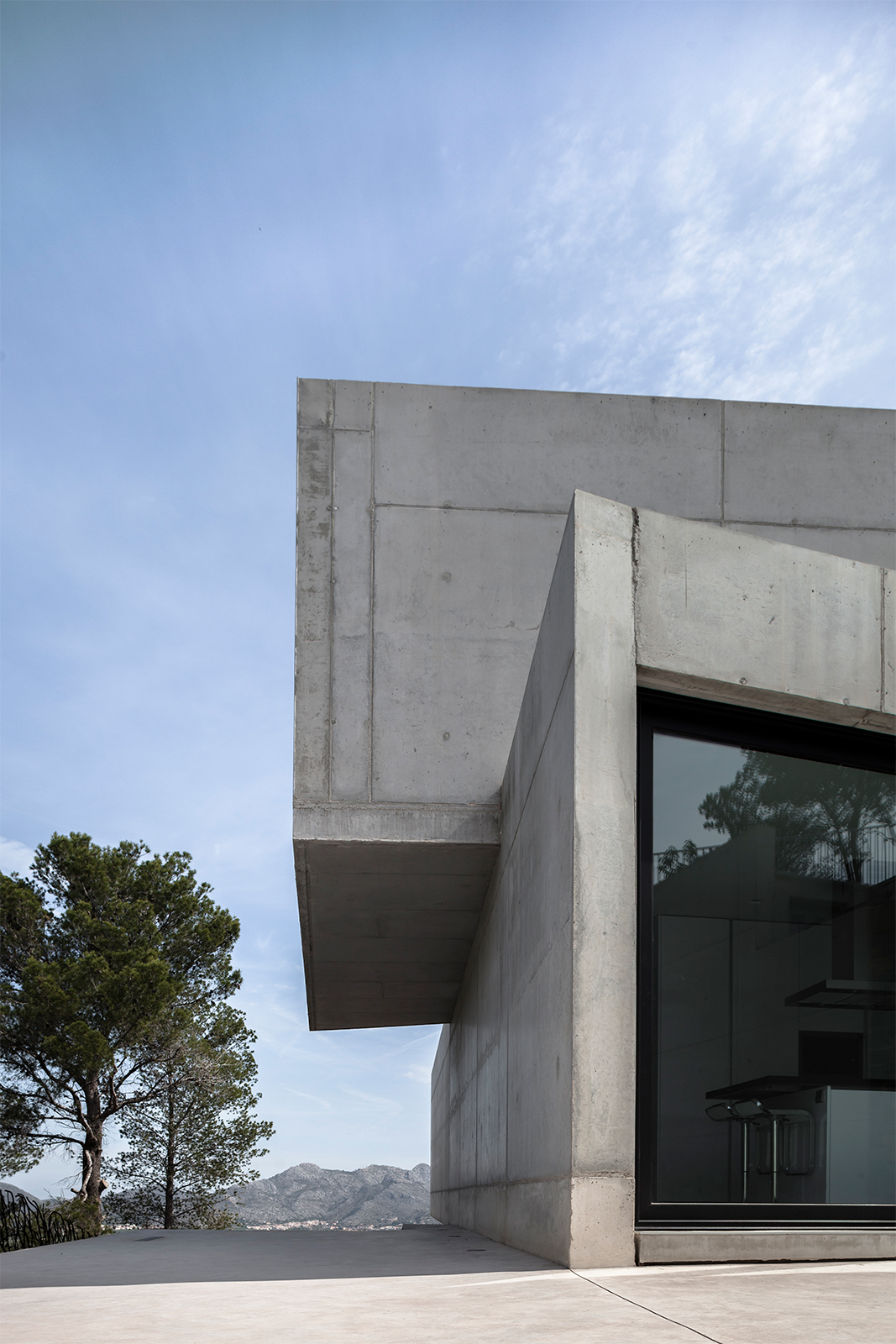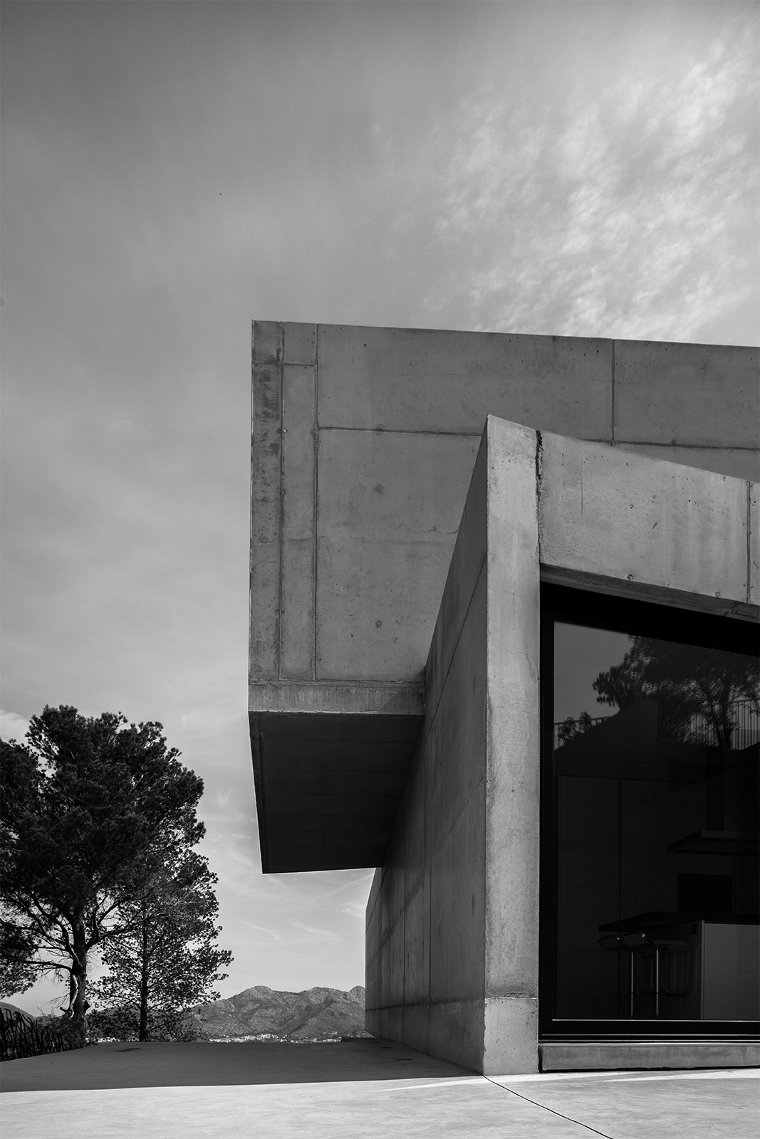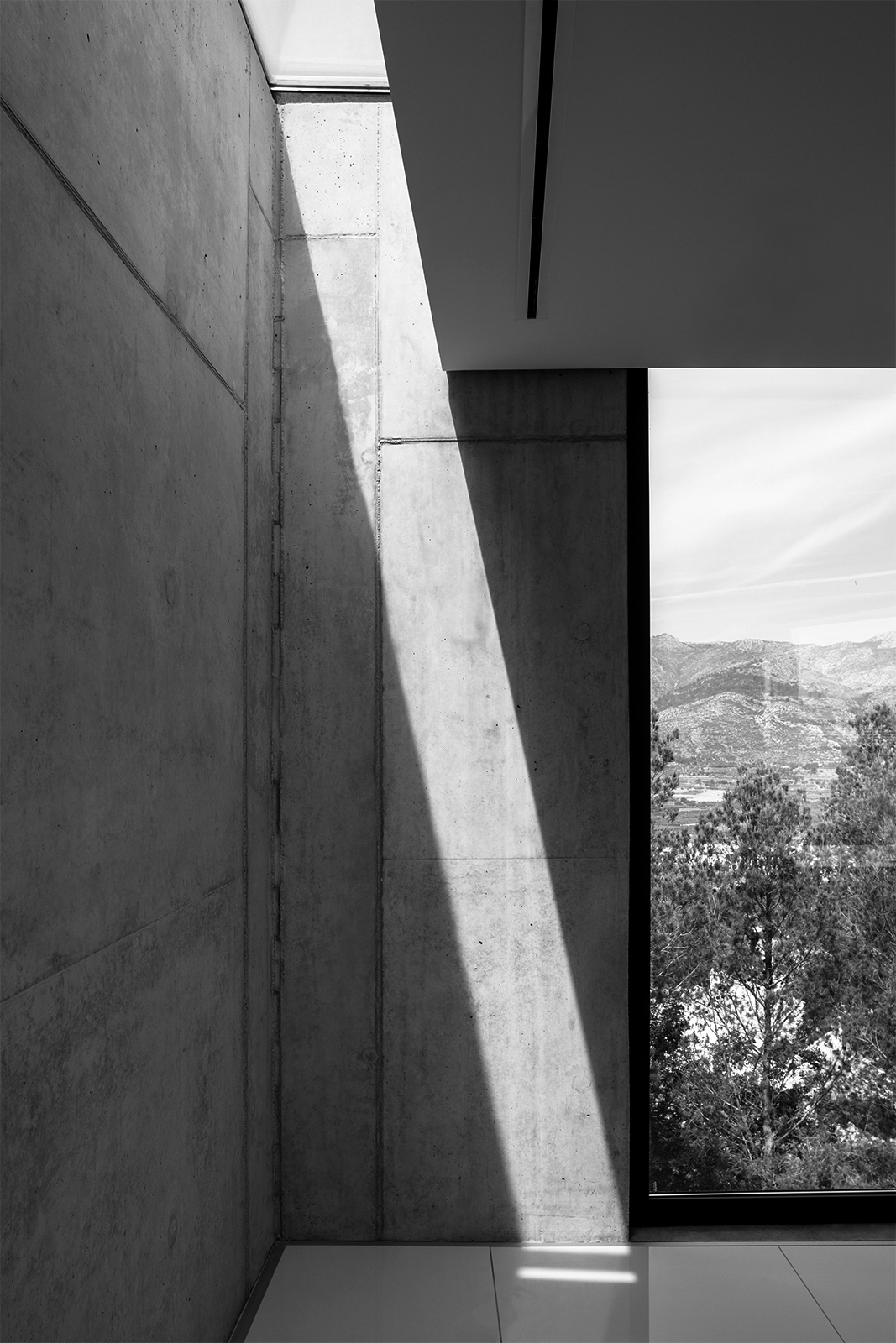 On the ascending trail to the house, the pathways of the plot create an alignment of visuals, in which the volumes of the house, placed like two superposed parts are seen in their ultimate grandiosity. In this way, the Aspre House is structured over two levels, two boxes of reinforced concrete, of an expressive nature, orthogonally situated and supported by the same stonework walls which divide the garden. Each room, responding to the programme of uses, whilst also possessing clear relational intentions, is dedicated to a day and night use on the ground and first floors respectively. At the convergence of both prisms, the access is found, distorting itself slightly towards the interior of one of its larger sides in order to indicate the entry and preserve part of the existing vegetation. The hard concrete doubles up on itself so that the tree can grow, like flowers born of a rock, whilst also enabling the appearance of intermediary spaces such as galleries and terraces.