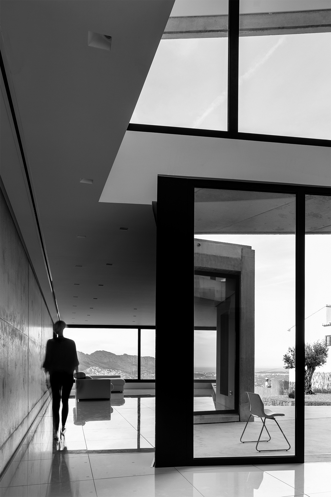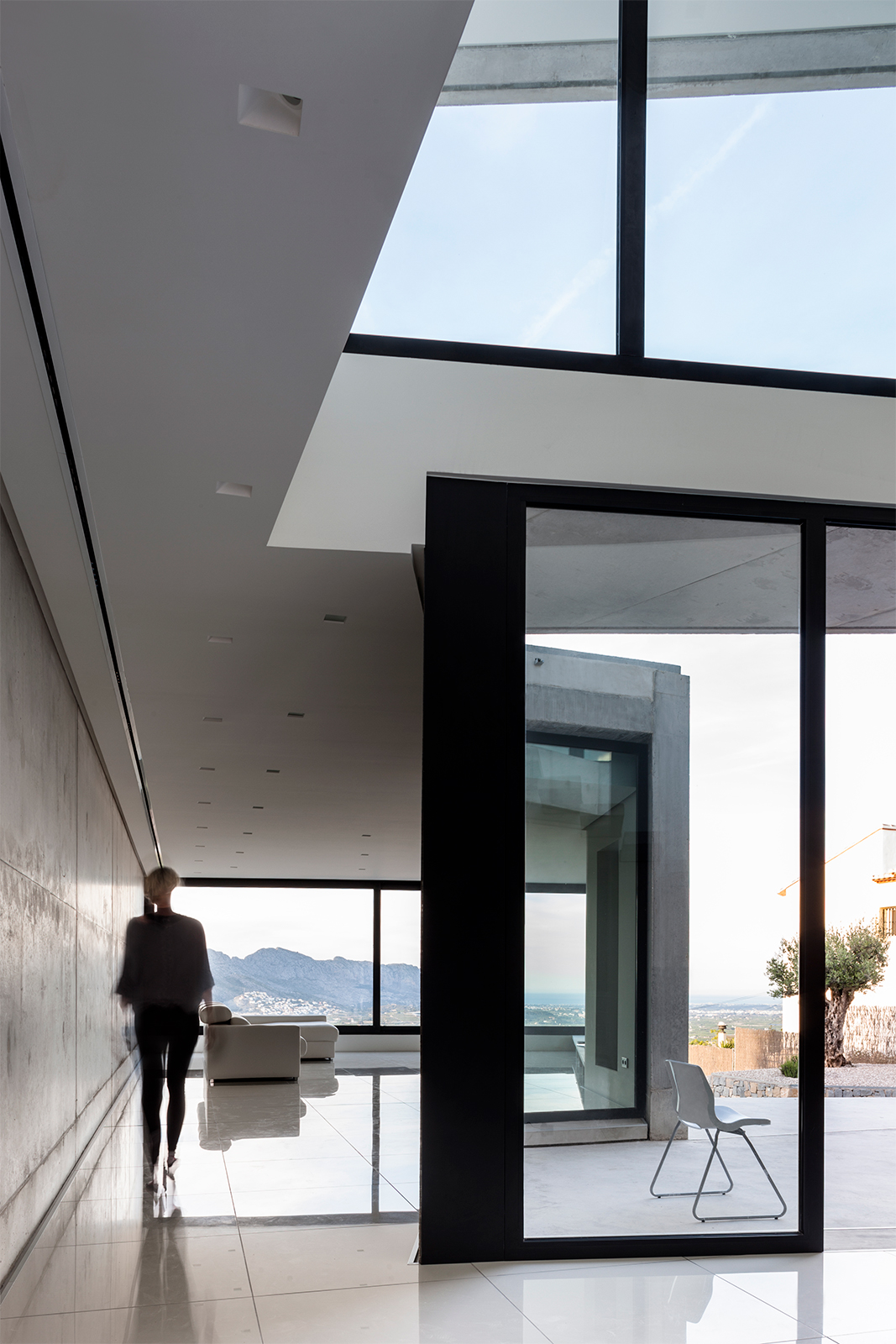 These basal parameters of architecture are interpreted in the Casa l’Aspre, a house in the Alicante town of Orba, situated on a pentagonal plot of nearly 1000m². The plot in a pencil-like form is marked by a steep slope, as is common in this area, which descends from south to north, surrounded by the perpetual presence of the sea, by Mediterranean vegetation of the characteristic green of the east, and by a residential and extensive occupation of the land.