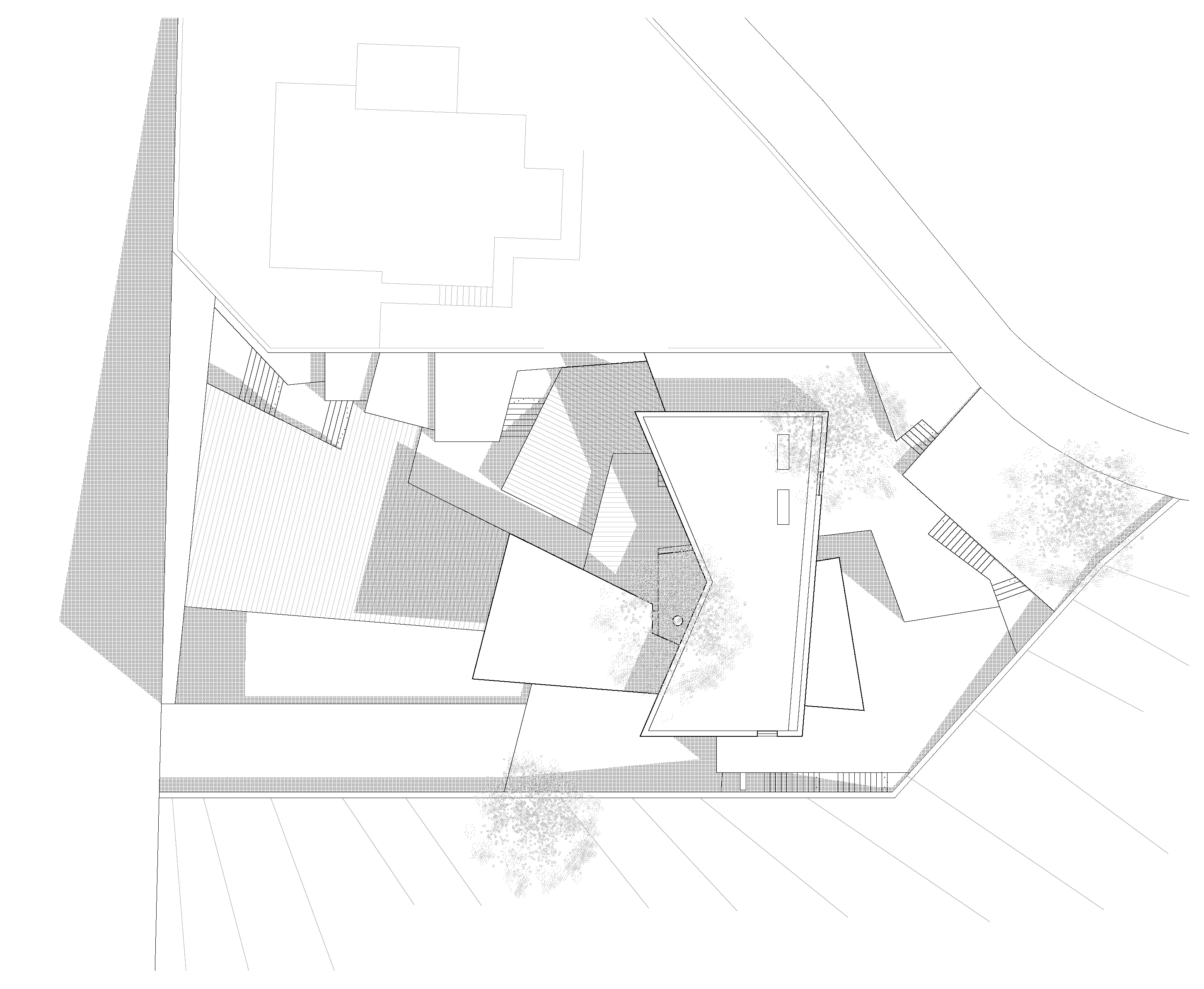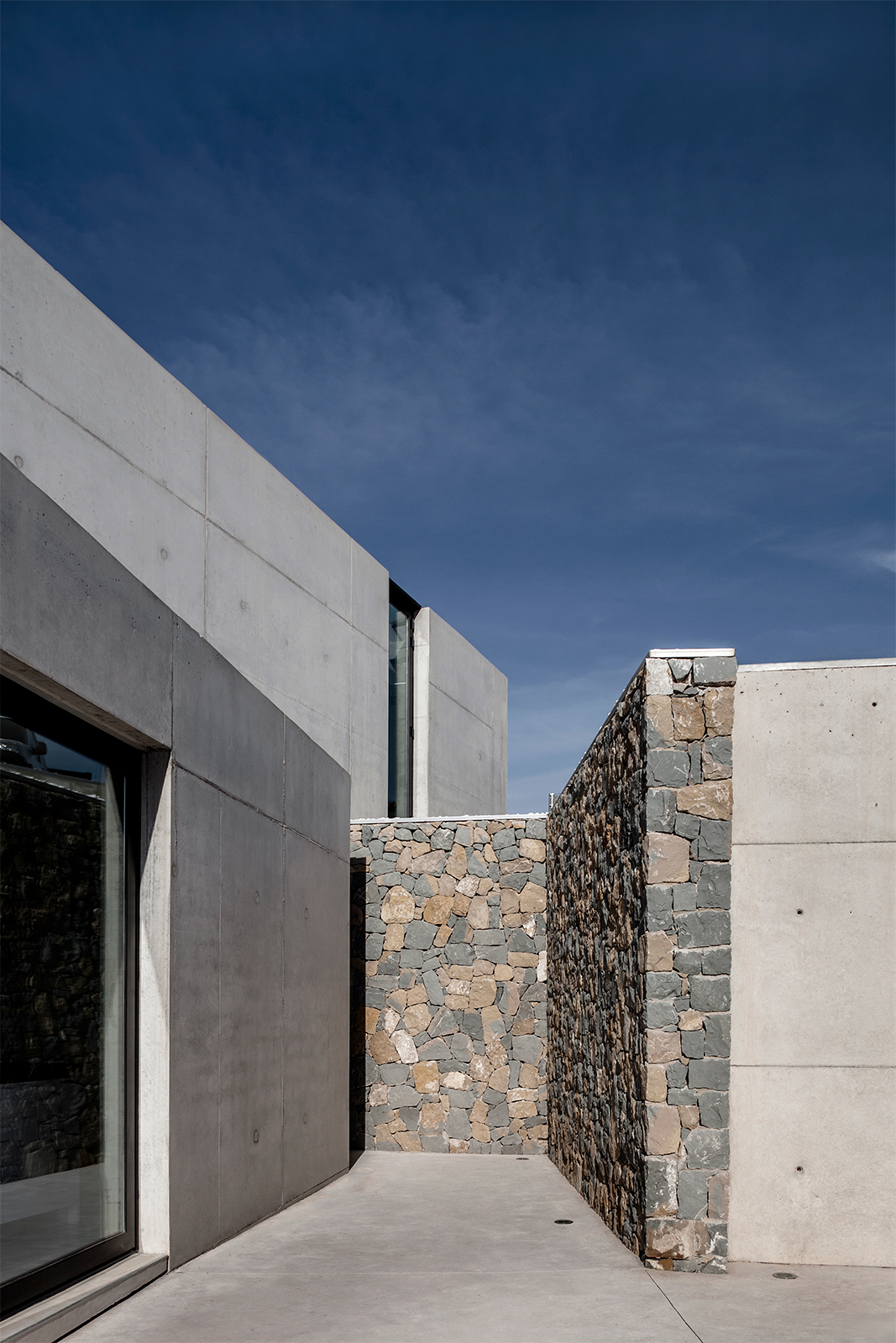 In terms of the location of the plot, the house is situated on the central part of the terrain, a position which allows it to frame the best panoramas, including the sea in the background. Access to the house is thus found at the lowest level, connected to the street and establishing the first point of promenade of the Aspre House. The organisation of the outdoor space results from the topography of the terrain, but also from the desire to preserve the existing woodland on the plot. In the aridity of the new house terrain, in which varying stone materials overlap, one can also spot the presence of forgotten vegetation throughout the house, giving it an enhancing backdrop.