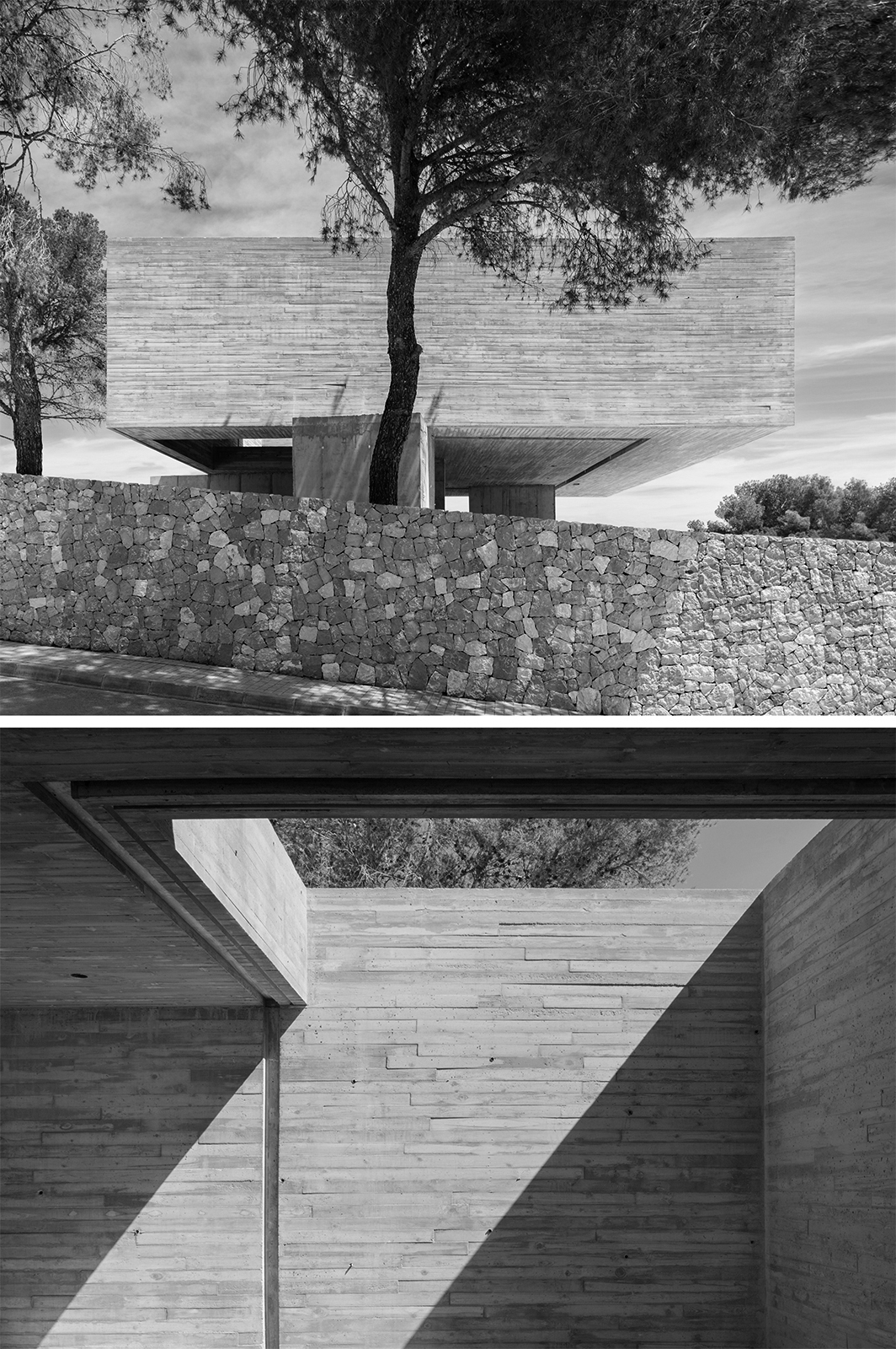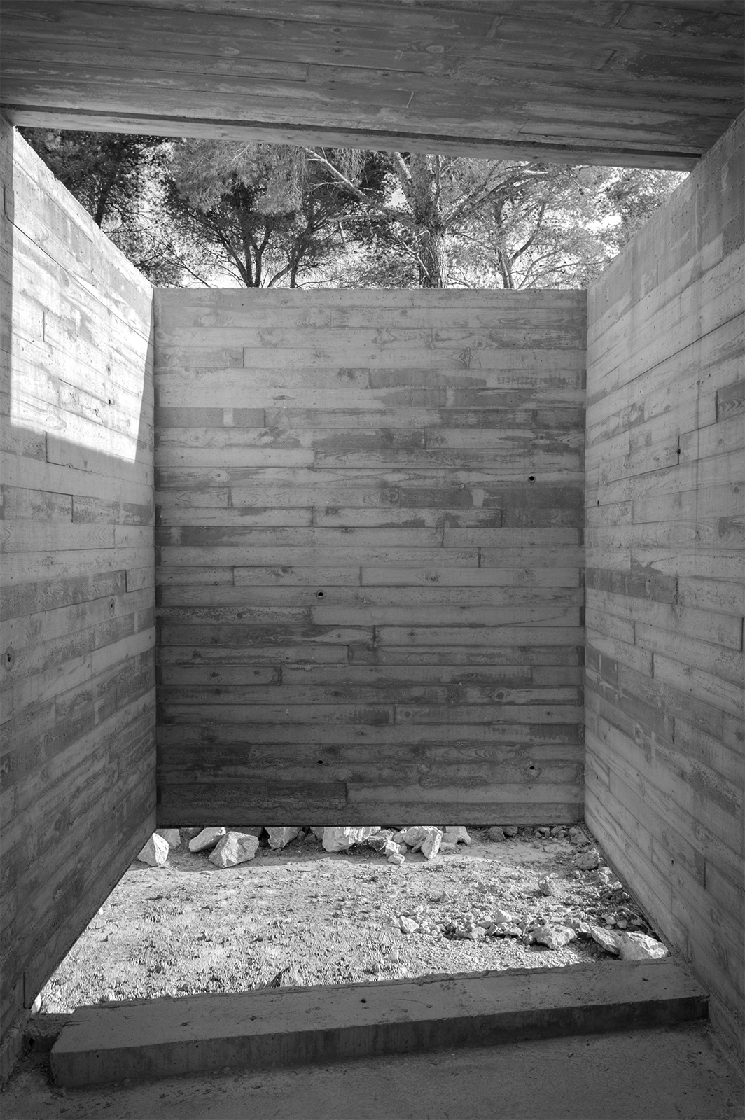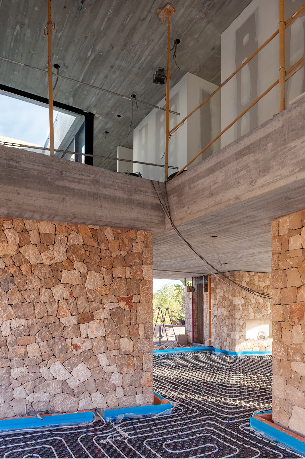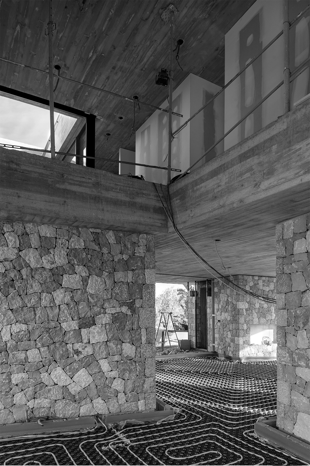 The supported volume is determined by a spatial concrete structure, meaning it can be treated as an independent piece, and rests on the boxes (made up of a 30 cm reinforced concrete wall on the inside and a 15 cm masonry lining on the outer face). Limestone and concrete, two types of stone, natural and industrialized respectively, are combined together in this work, which in turn highlight the character and use of the different spaces.
