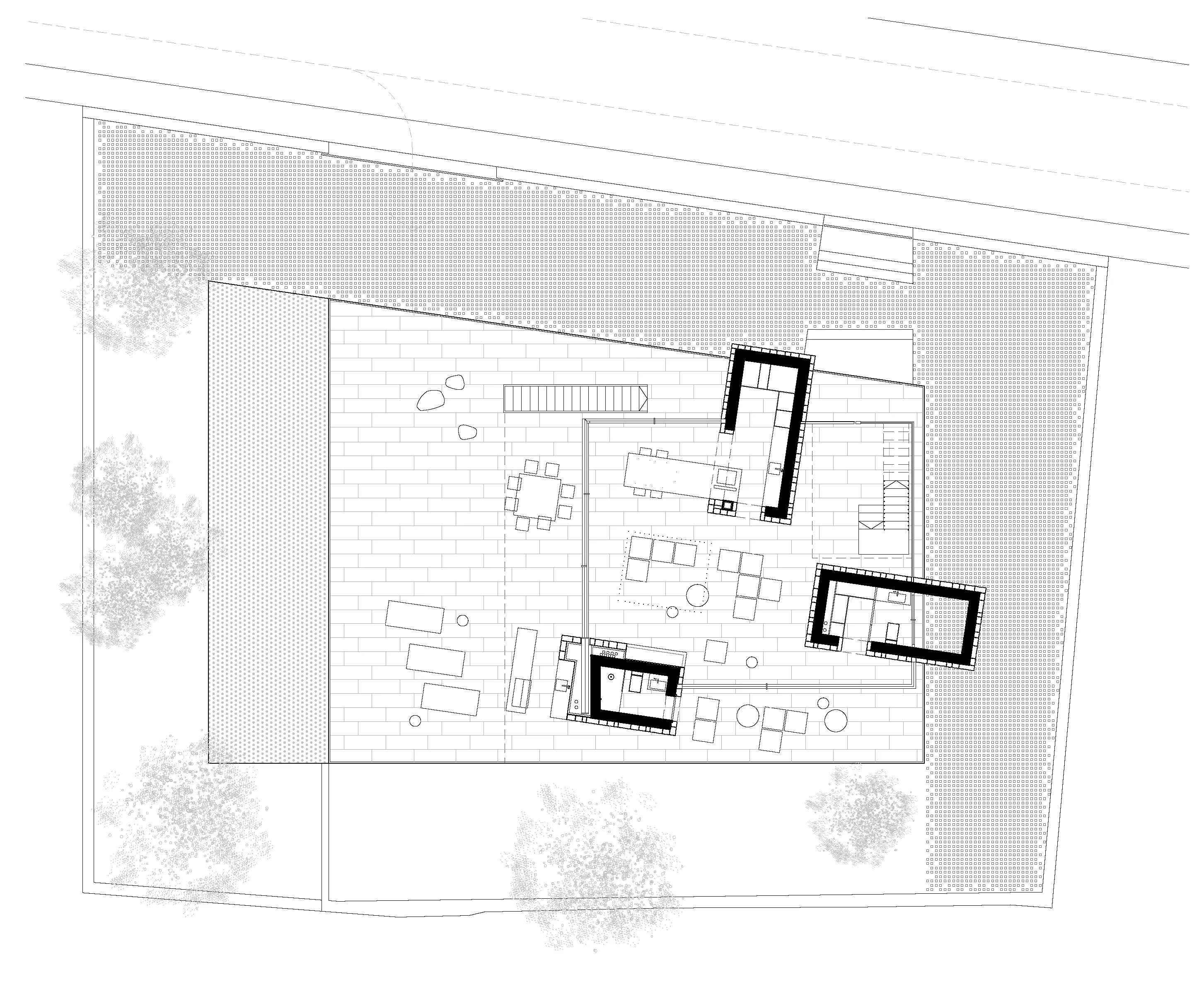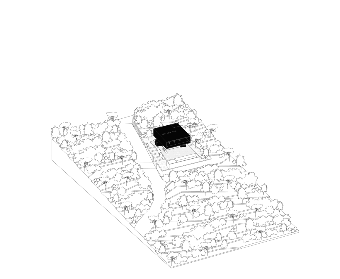 The house, organized across a semi-basement, ground floor and first floor, is presented via the inversion of masses: an imposing, heavy, upper body, and an open, light ground floor. In construction terms, this is made possible thanks to the projection of boxes on the ground floor that will host the server spaces, whilst also acting as structural walls, thereby distributing the load, leaving the rest of the floor free. From the inside, the double height spaces in the staircase area allow the section to be read as a direct reflection of the whole construction: its rotundity and its elevation.